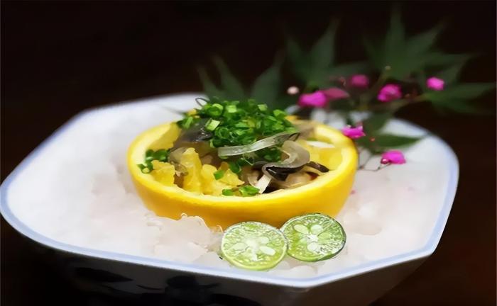2、將橙子洗淨,挖出果肉,改刀切丁,加魚皮絲、水果醋拌勻,裝入挖空的橙子內,放入冰盤,撒蔥花即可。