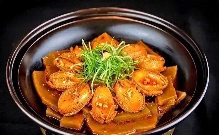 說明:這是一道創新家常菜,用冷盤的紅油製作熱菜。鮑魚汆水不宜太老,要保持飽滿、細嫩彈牙的口感。因坨粉自帶芡粉,故勾芡不宜太濃,否則會糊在一起。
