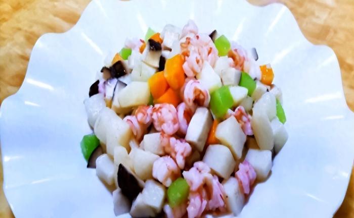 蝦仁100克、馬蹄5個、香菇3個、胡蘿蔔30克、萵筍30克、鹽5克、白糖3克、胡椒粉、料酒、生粉。