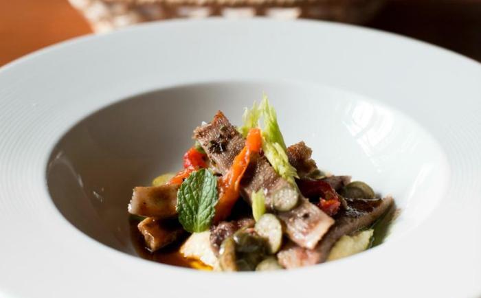 然後享用精緻的燉牛尾,這是嫩肉和芳香香草 gremolata 的混合物,搭配手卷的撒丁島義大利麵。如果您偏愛肉類,那就嚐嚐他們的上等切烤乳豬 (Porchetta),這種烤乳豬由有機豬肉製成,捲上芳香茴香、大蒜和迷迭香,然後烤至完美。
