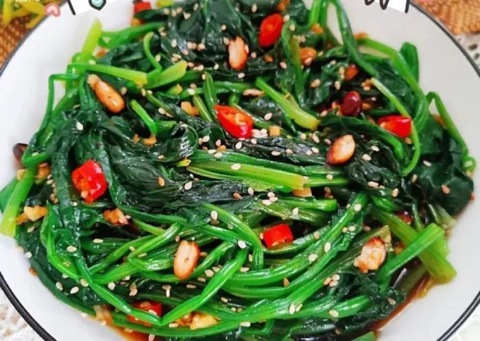 菠菜、蒜瓣、花生米、白芝麻、生抽、陳醋、食鹽、白砂糖、小米辣