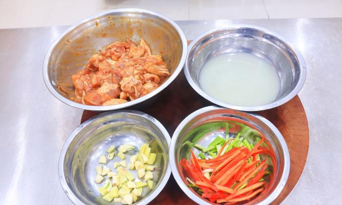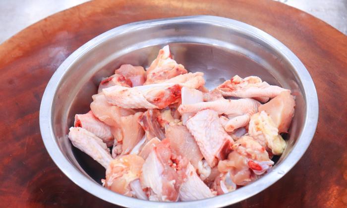 1.三黃雞買回來以後再清洗一遍,去除上面殘留的雞毛和多餘的雞油,然後把山黃雞一分為二,把雞肉剁成均勻小塊去除雞腳趾放在一邊,晾乾水分以後醃一下,雞塊晾乾水以後才能更好的吸收料汁入味。